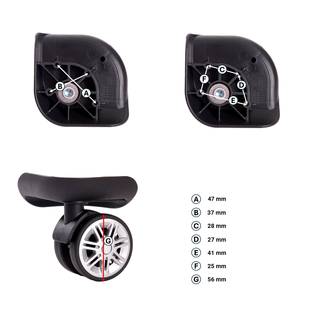 Pro zachování jednotné výšky a prevenci zvýšeného opotřebení se doporučuje vyměnit všechny Kolečka kufru současně. Pokud je však třeba vyměnit pouze jeden Kolečka, nabízíme samostatné Kolečka se dvěma orientacemi, které dokonale zapadnou do obalu.